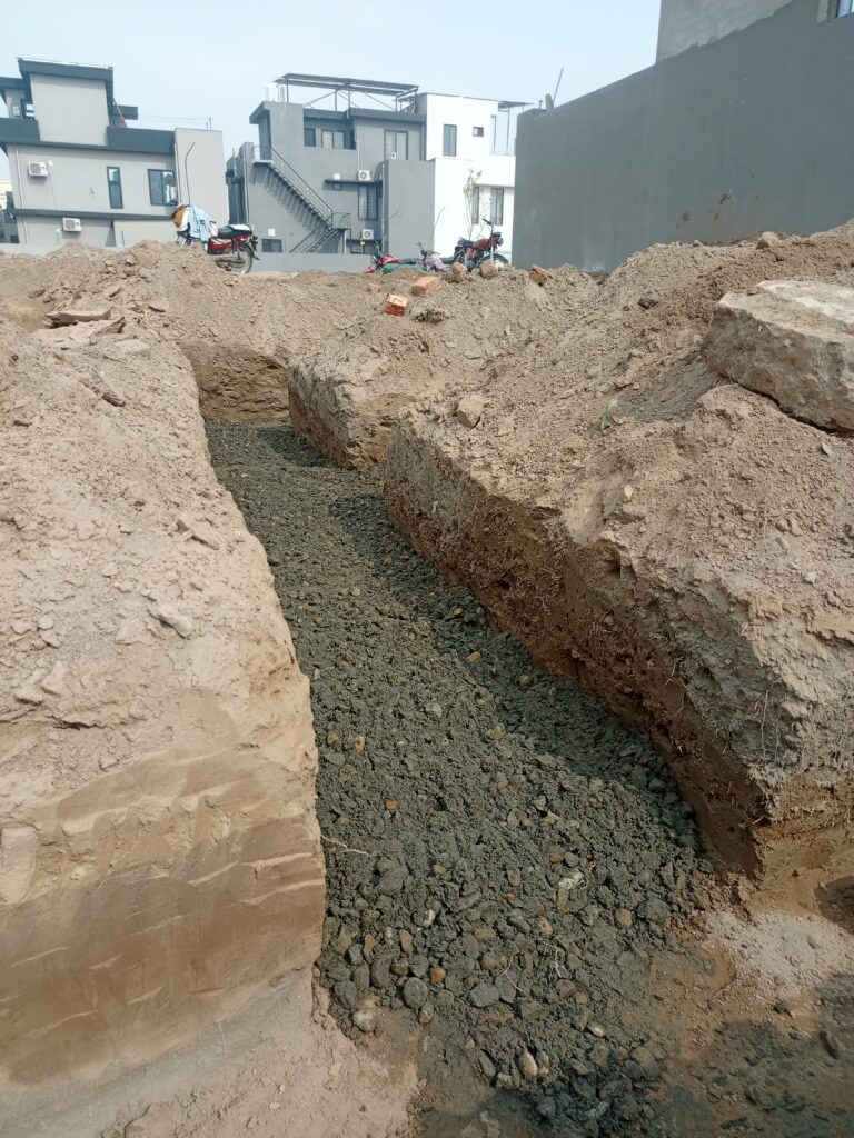 Installation of underground electrical conduits and piping for future utility connections.